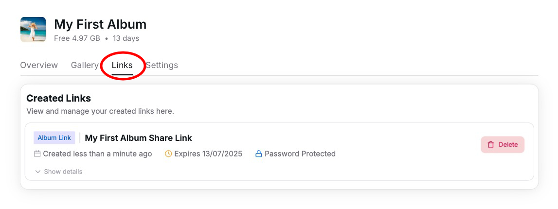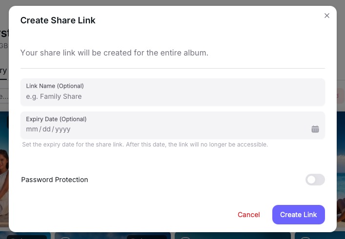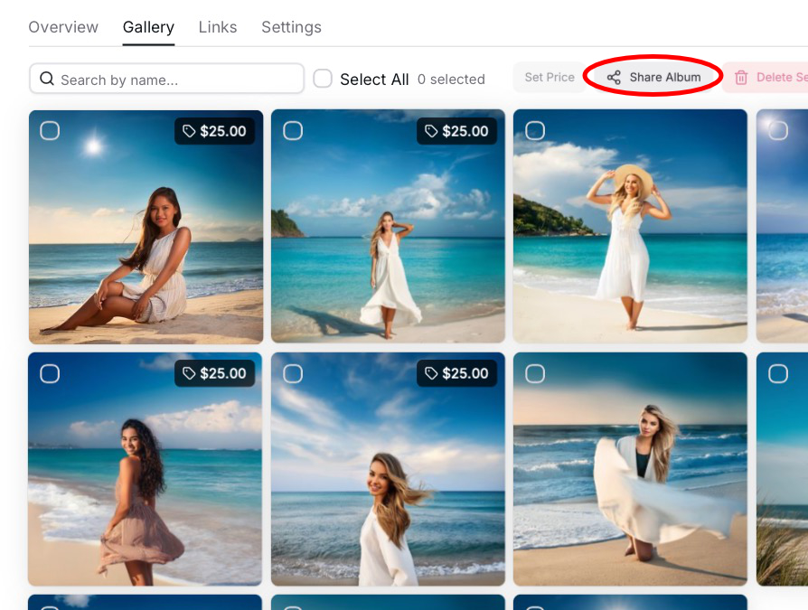 “Share Album” is only active when you have not selected any photos. If you have selected photos it will change in to “Share Photos”.